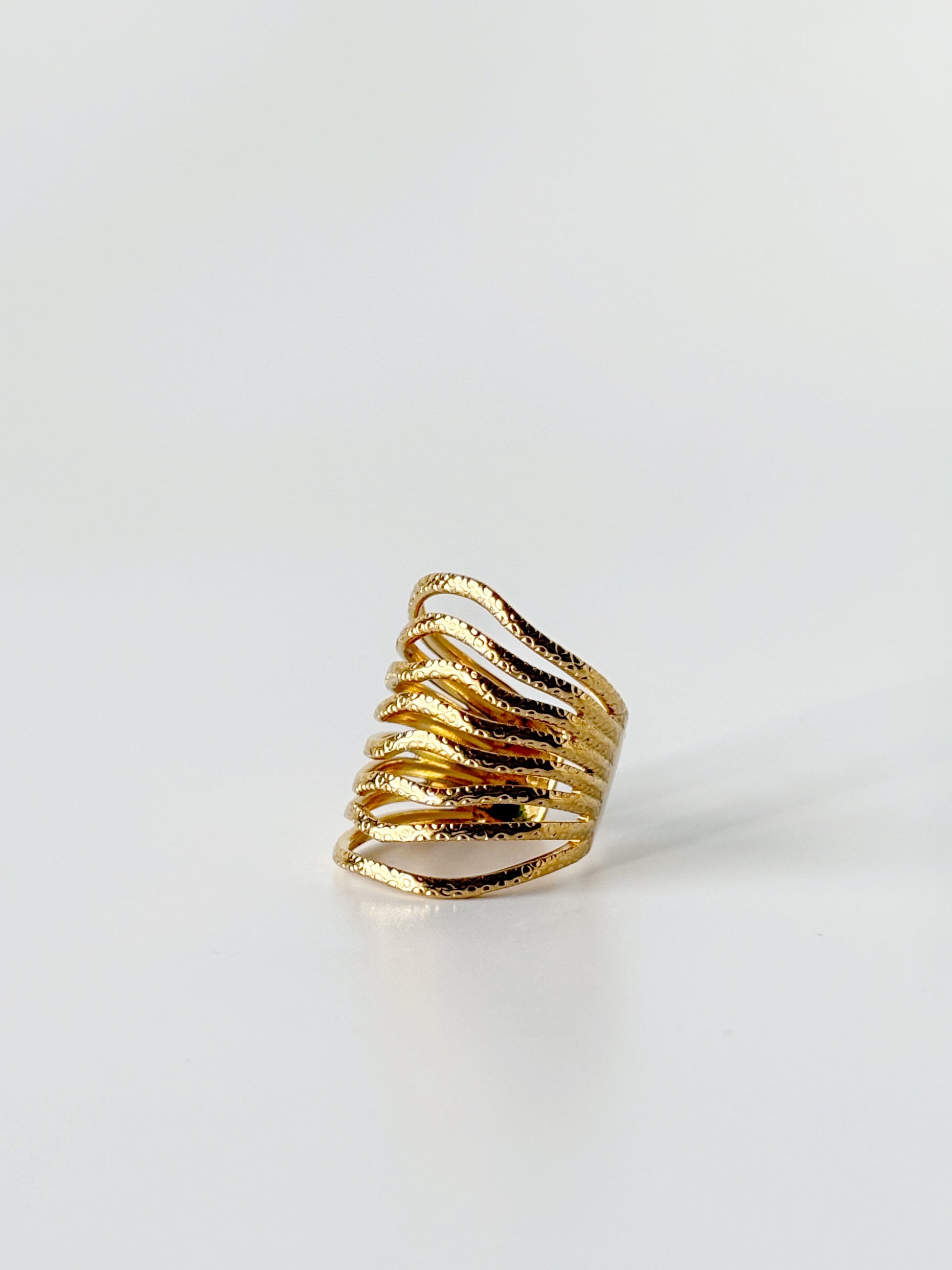 Make a striking impression with our gold-plated multi-band statement ring, featuring gracefully curved, textured bands that wrap around the finger. This architectural piece offers a bold and contemporary look, perfect for adding artistic flair to your ensemble.