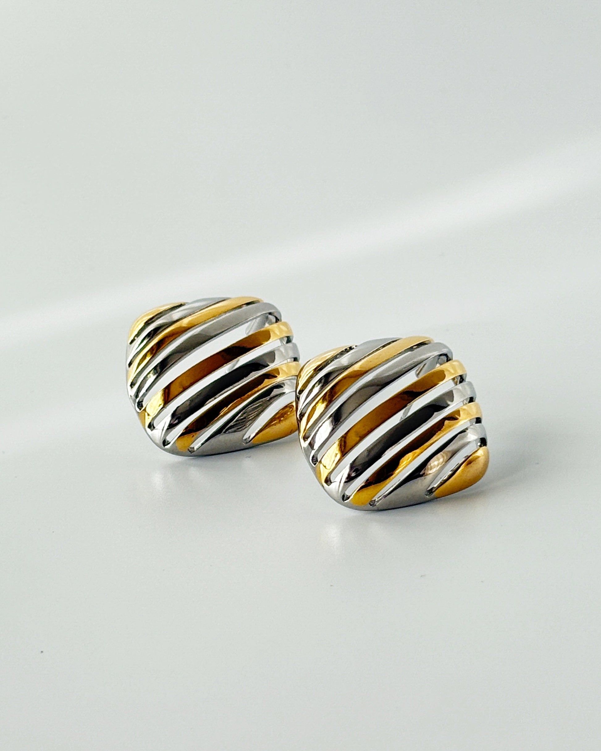 These studs showcase a bold, contemporary design with alternating stripes of polished gold and silver tones, creating a dynamic visual contrast.