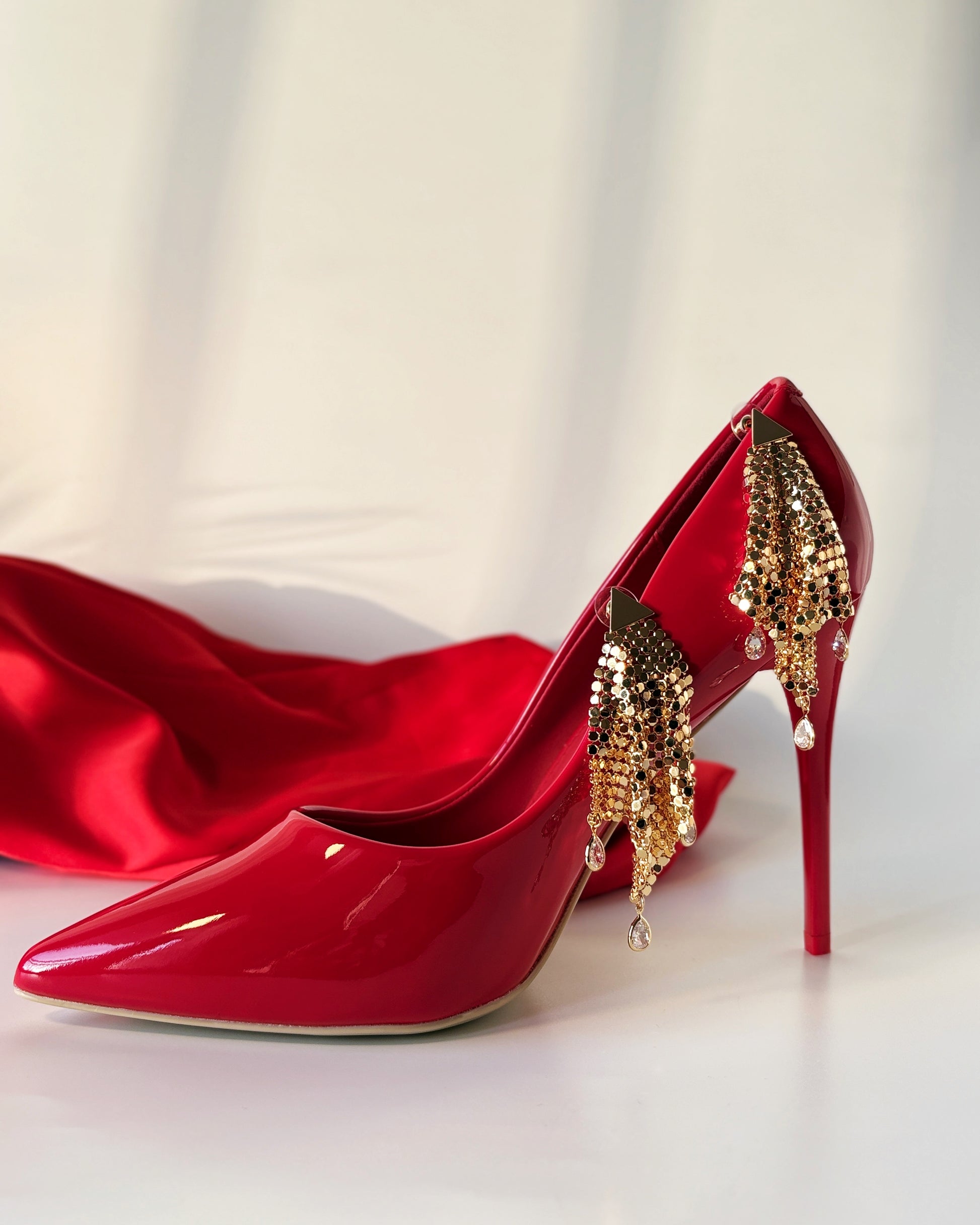 These danglers feature a geometric triangular stud from which multiple delicate chains, adorned with tiny gold discs and sparkling teardrop crystals, cascade gracefully.