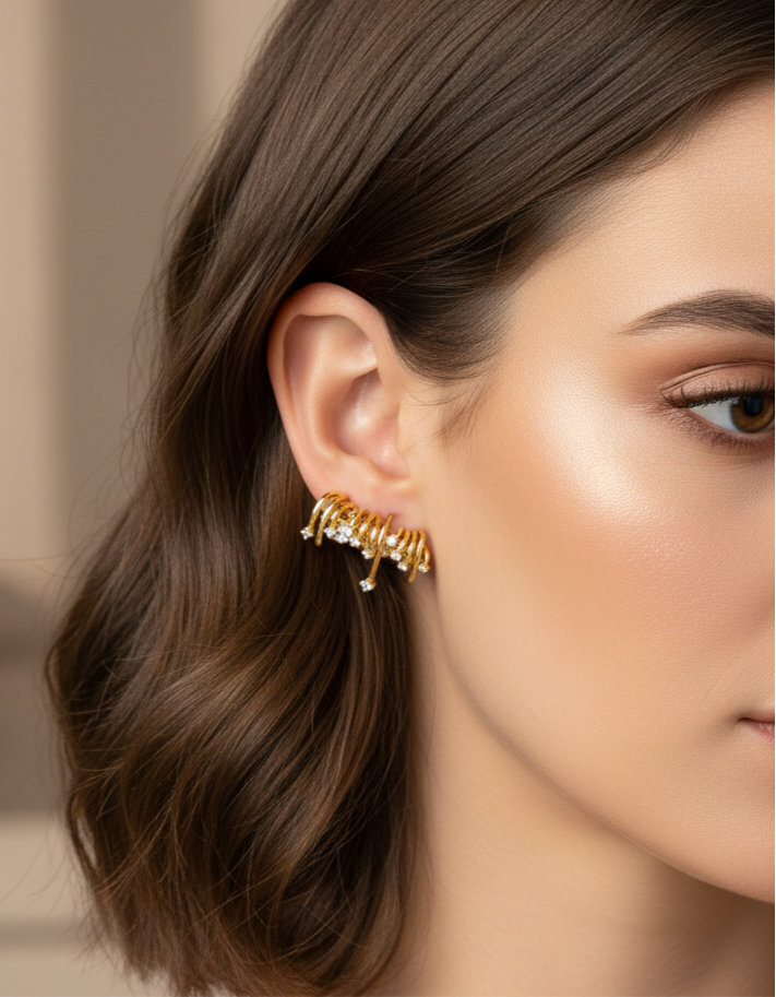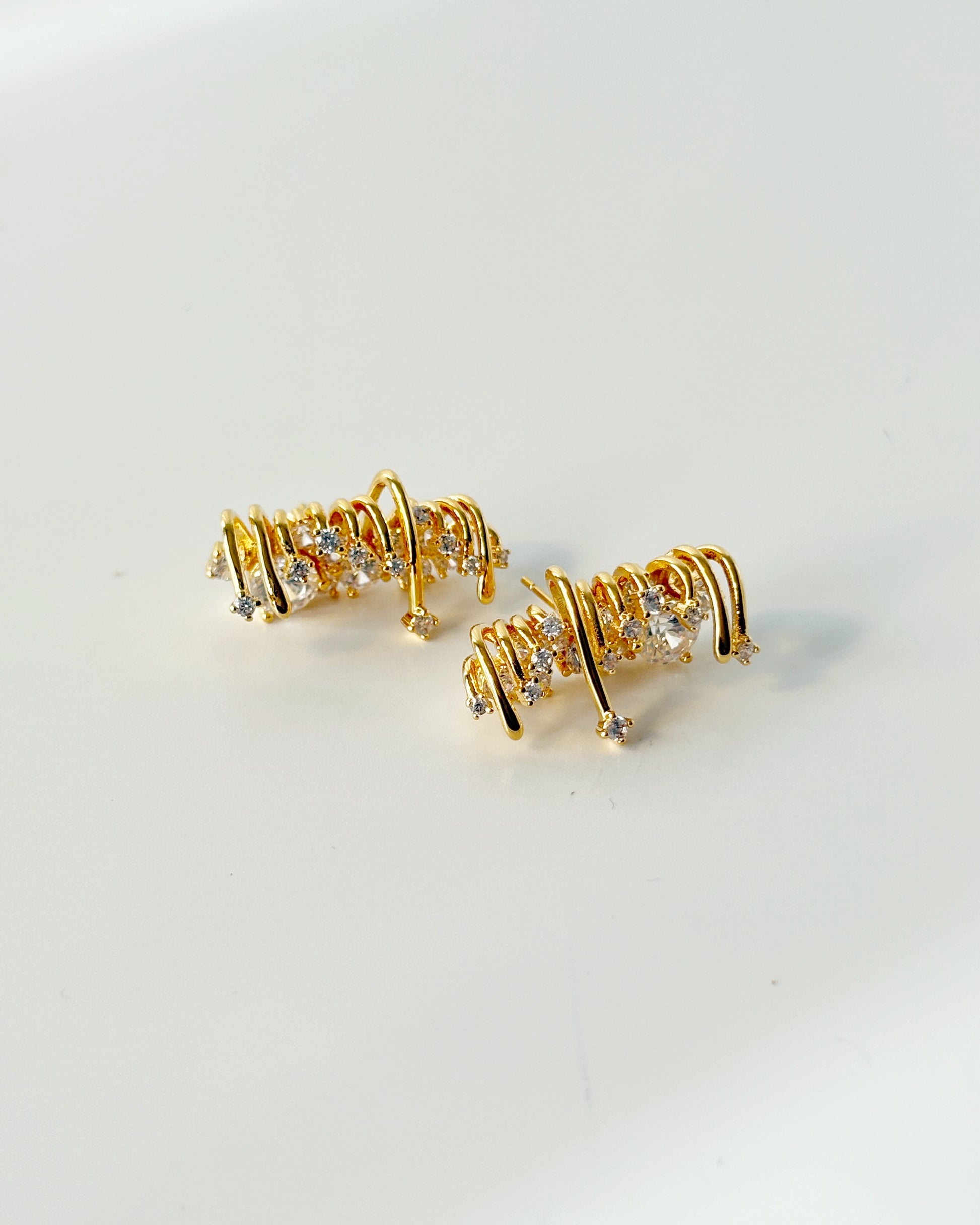 The Helix Cluster Crawler earrings feature a captivating spiral design adorned with sparkling cubic zirconia stones, creating a dazzling climb up the earlobe.