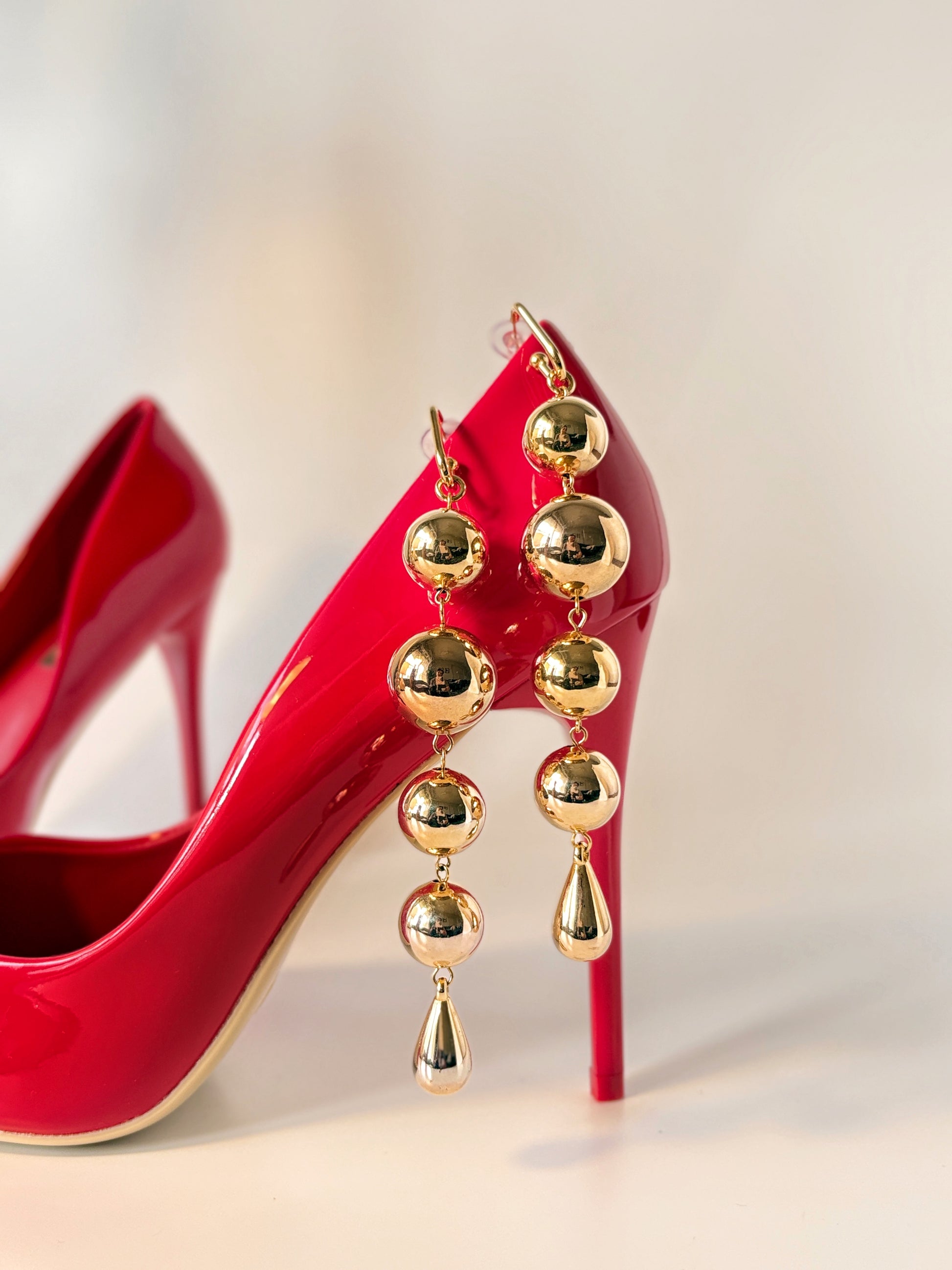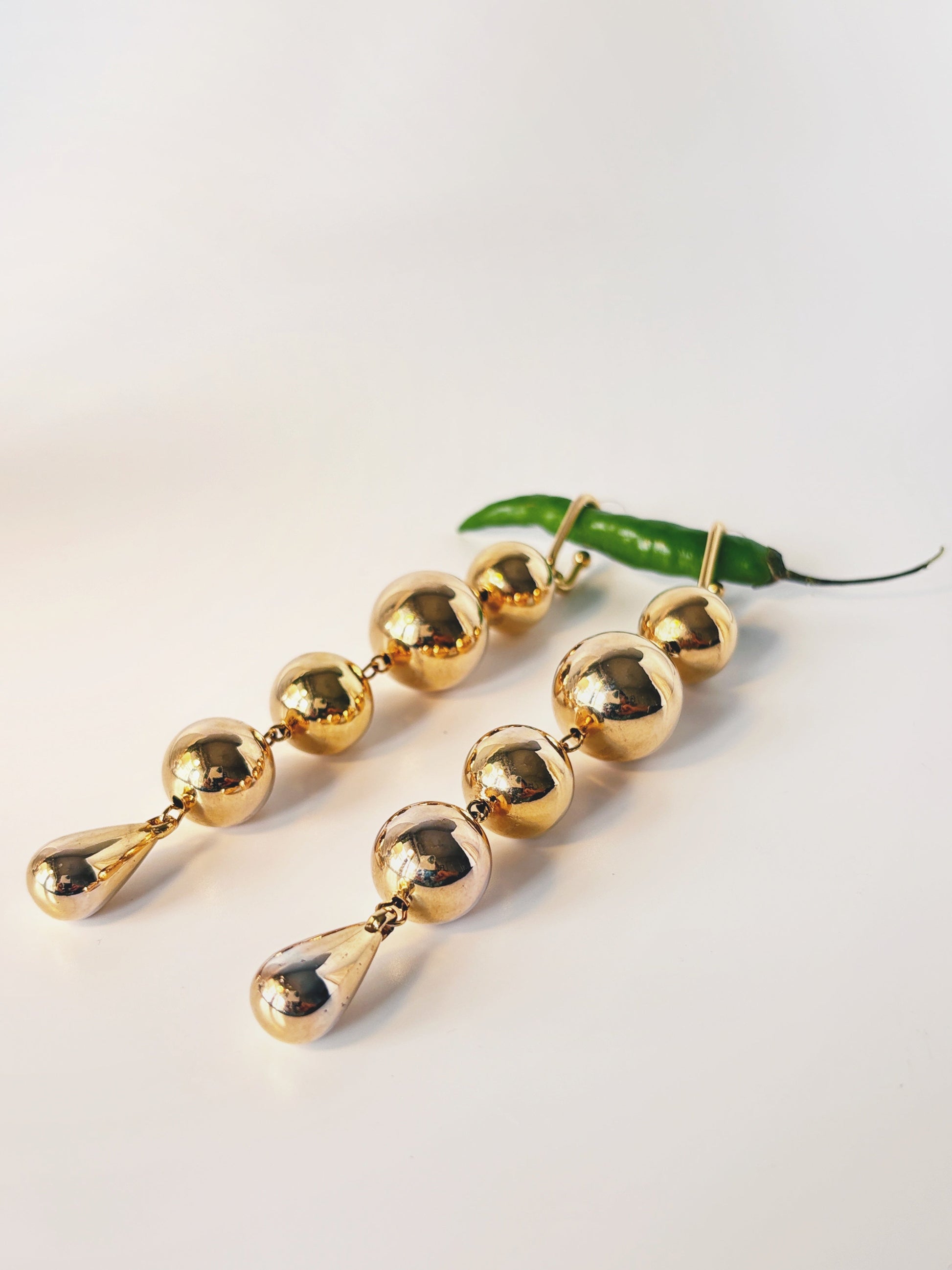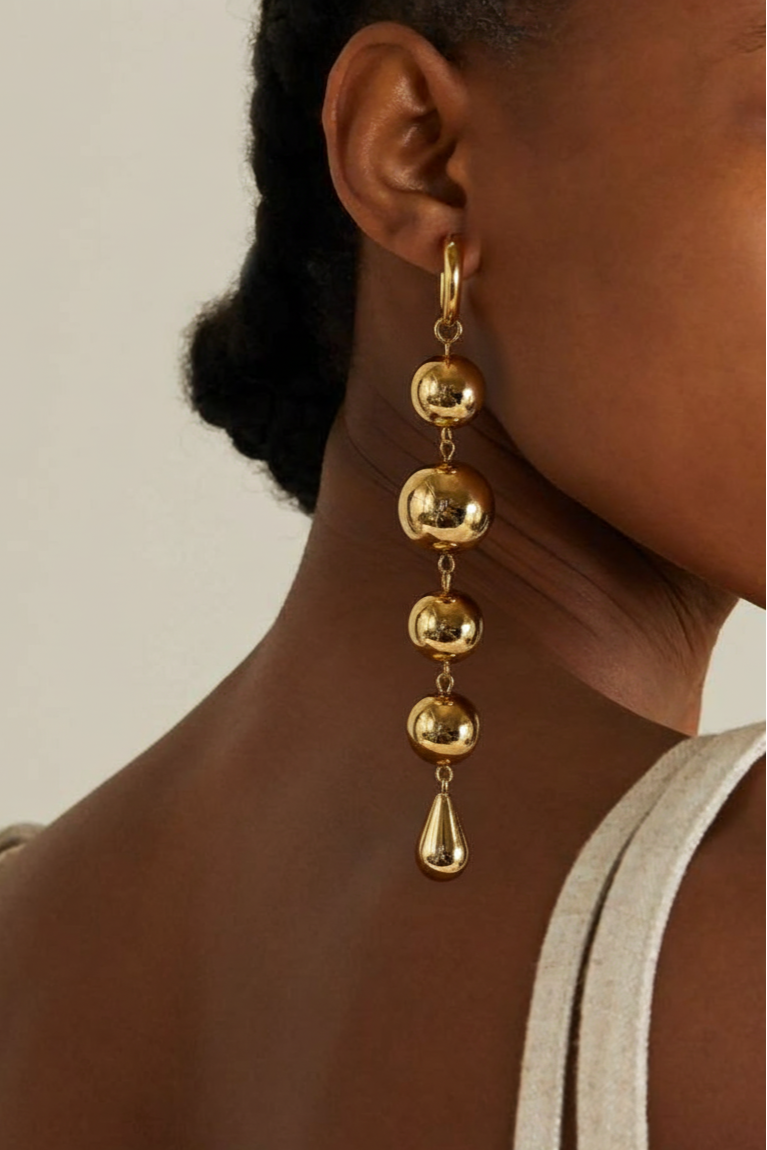 These stunning gold-toned drop earrings feature a captivating design of graduated spheres, culminating in a delicate teardrop accent. Their elongated silhouette and polished finish create a luxurious and eye-catching statement, perfect for adding a touch of elegance to any ensemble.