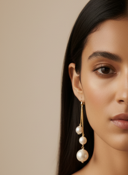 These elegant danglers feature a delicate gold chain suspending a trio of lustrous pearls, graduated in size for a sophisticated cascade. The timeless combination of gold and pearls offers a classic yet striking accessory, perfect for adding refined charm to any look.