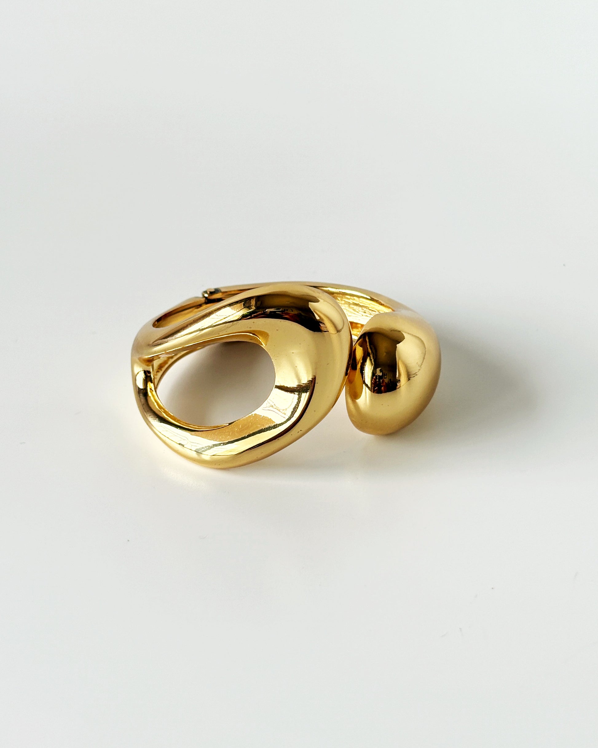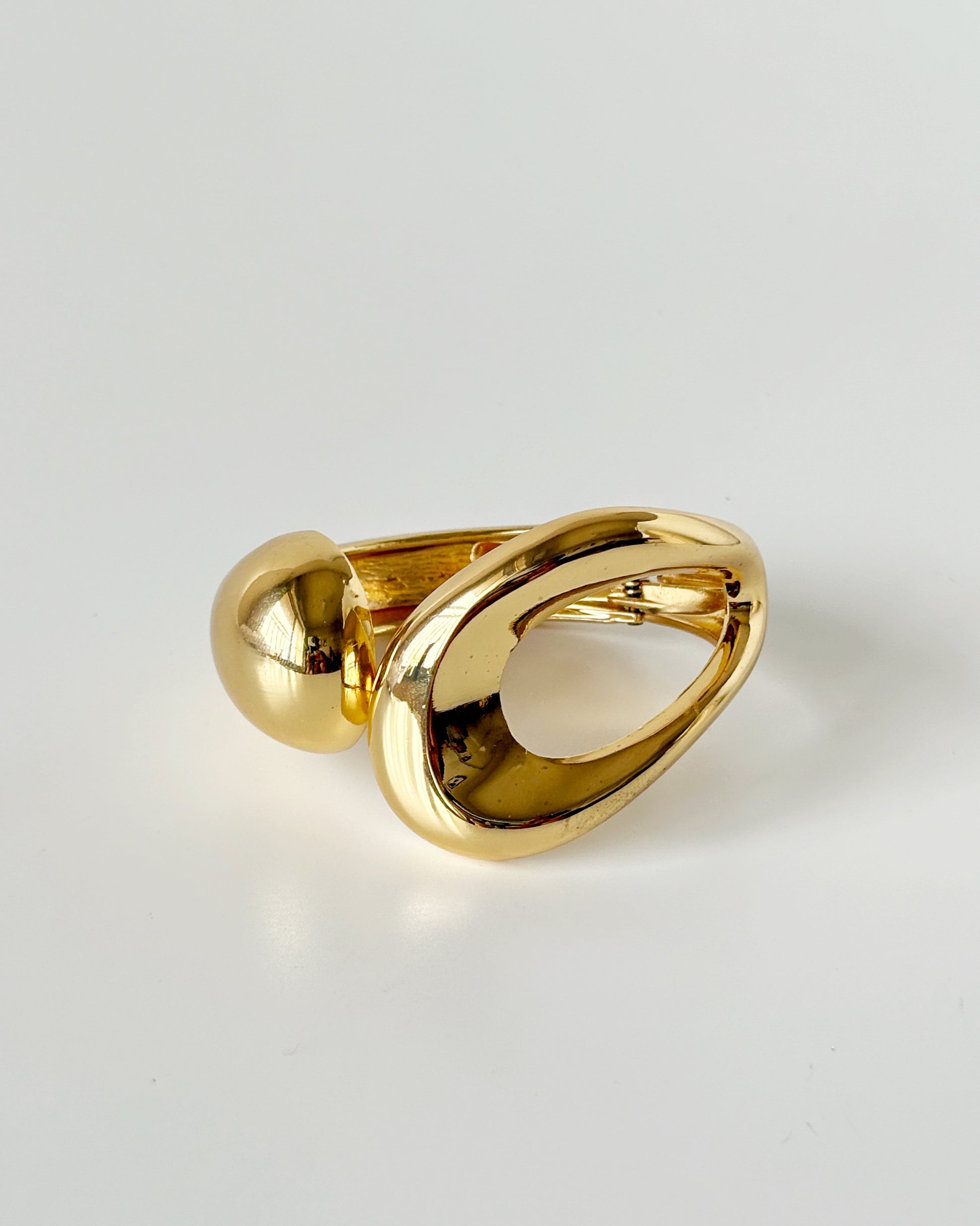 This cuff bracelet features a polished gold-toned design with a sculptural, organic form. It showcases two prominent, contrasting elements: one a smooth, solid dome, and the other an elegantly contoured open loop.